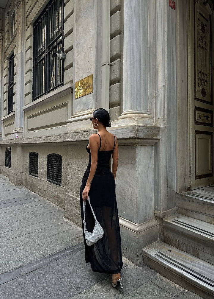Part of our statement dress collection, this romantic yet bold maxi dress is designed to highlight your natural shape with effortless elegance. Crafted from a smooth, flowy fabric with added stretch, it features delicate ruffle trims and a deep V-neckline that creates a beautifully feminine silhouette. Slim spaghetti straps and a fluid drape make it the perfect blend of soft, sexy, and sophisticated.