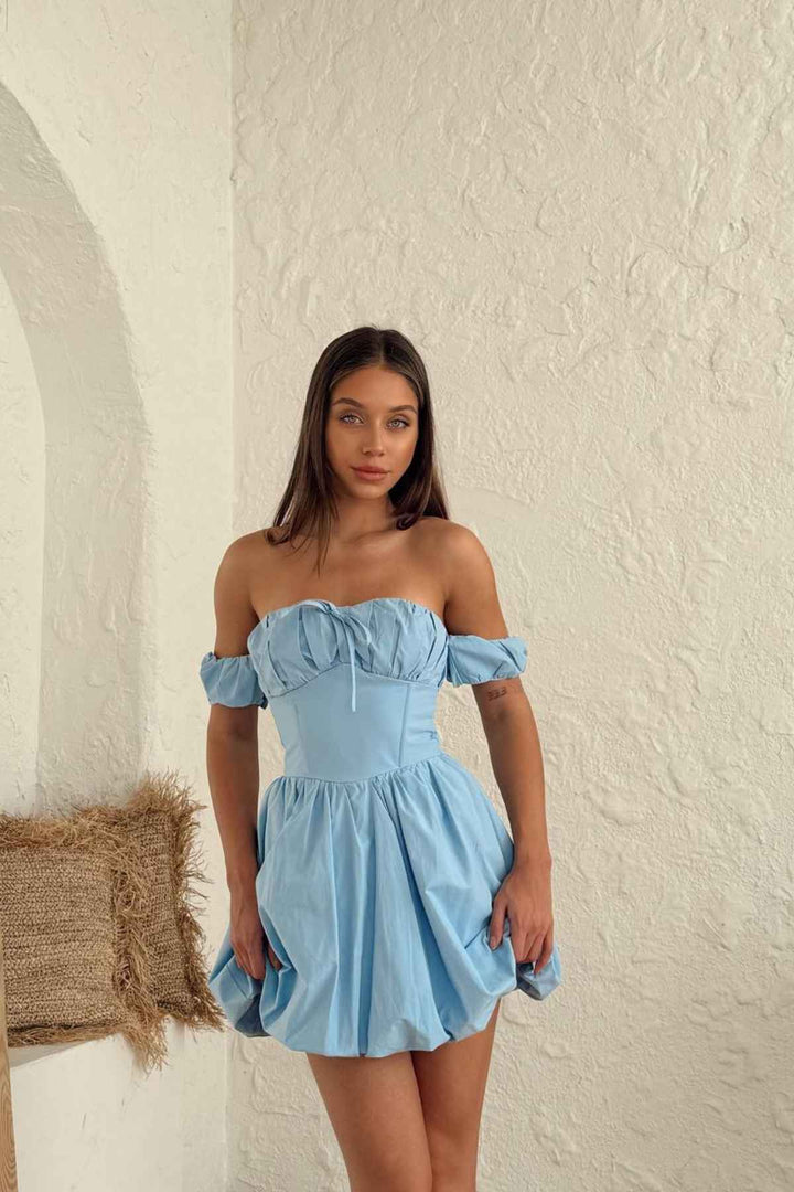 The short puff sleeves gracefully sit off the shoulders, adding a romantic touch to your look.