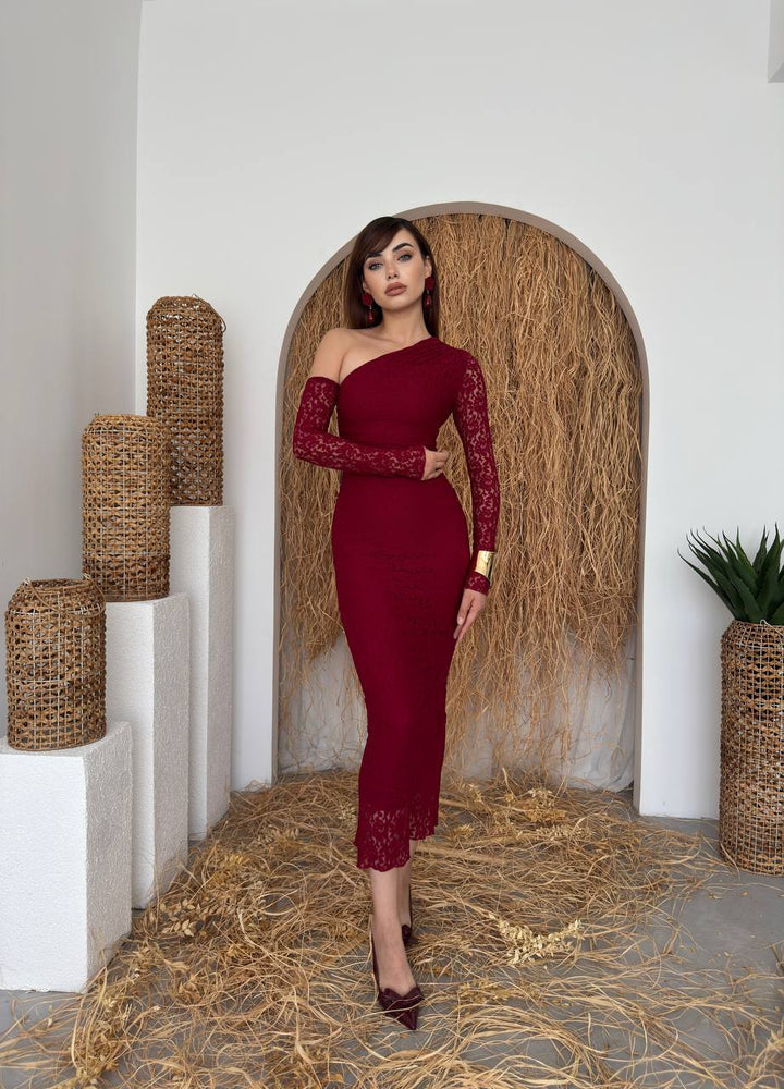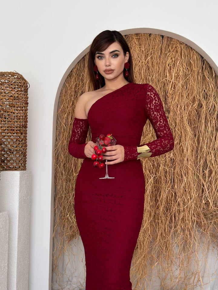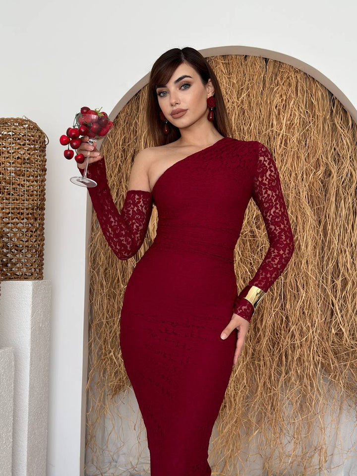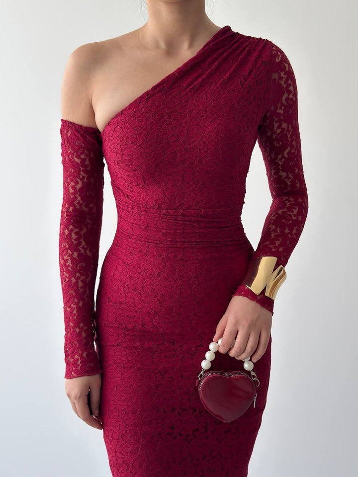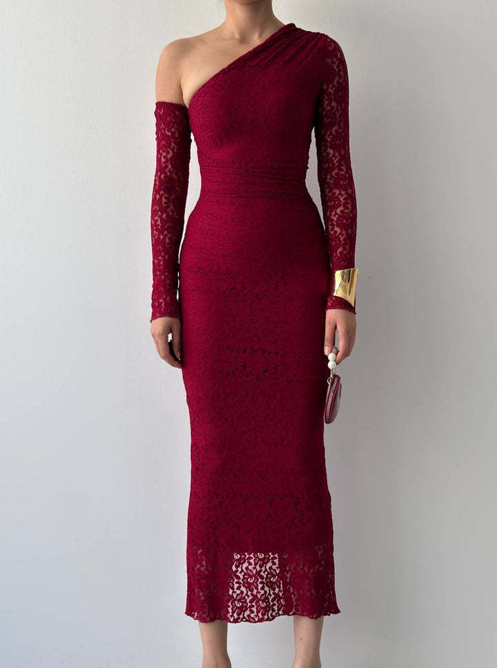 Elevate your holiday celebrations in this stunning one-shoulder lace dress.