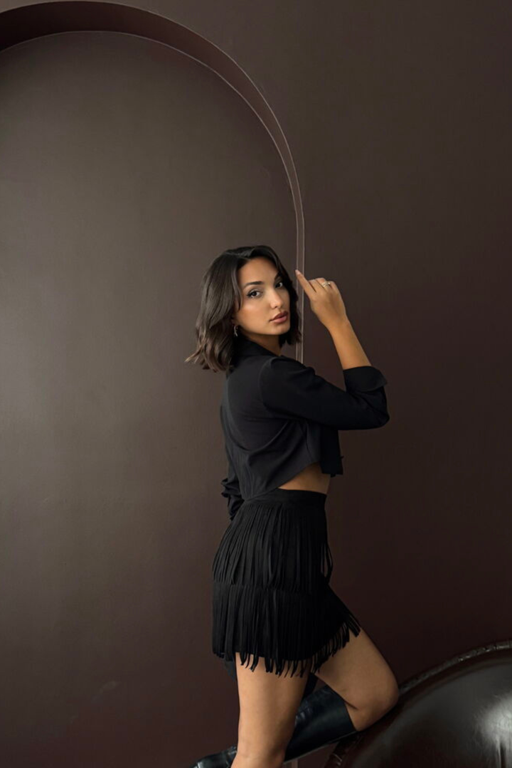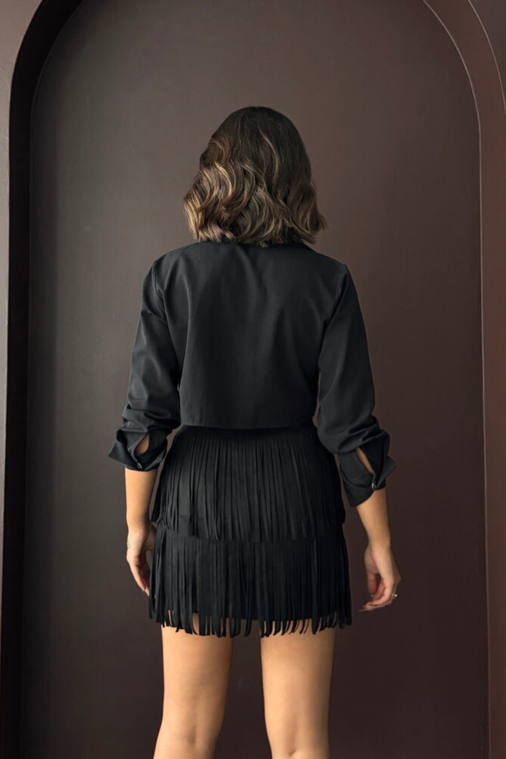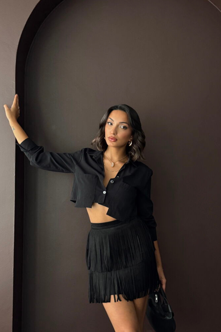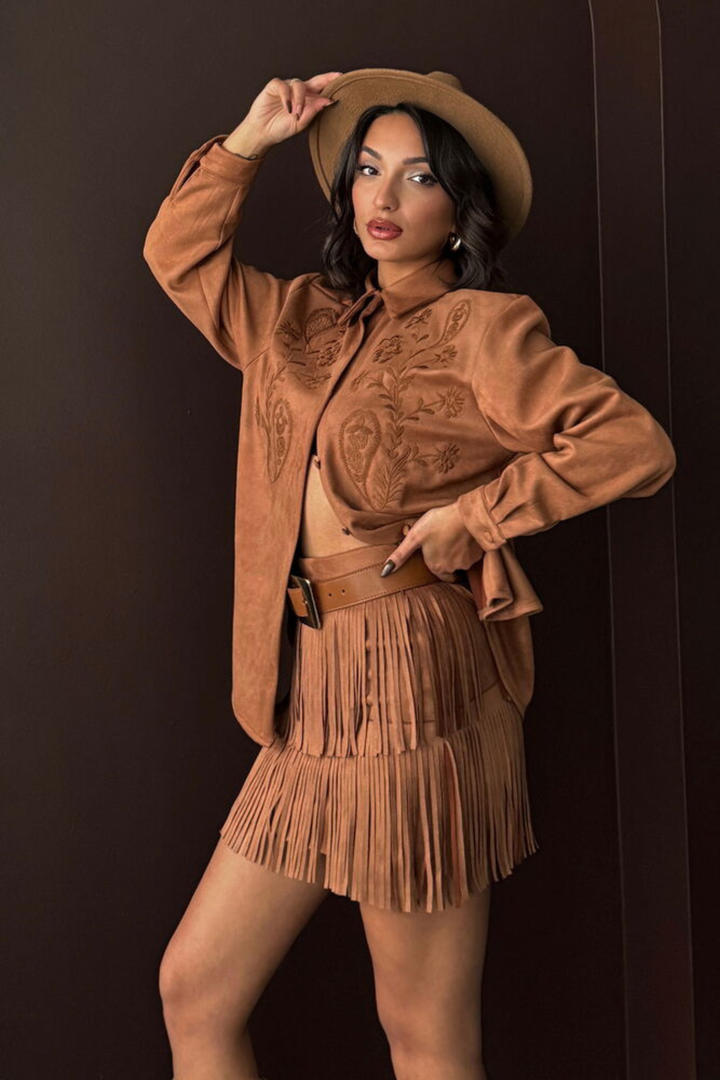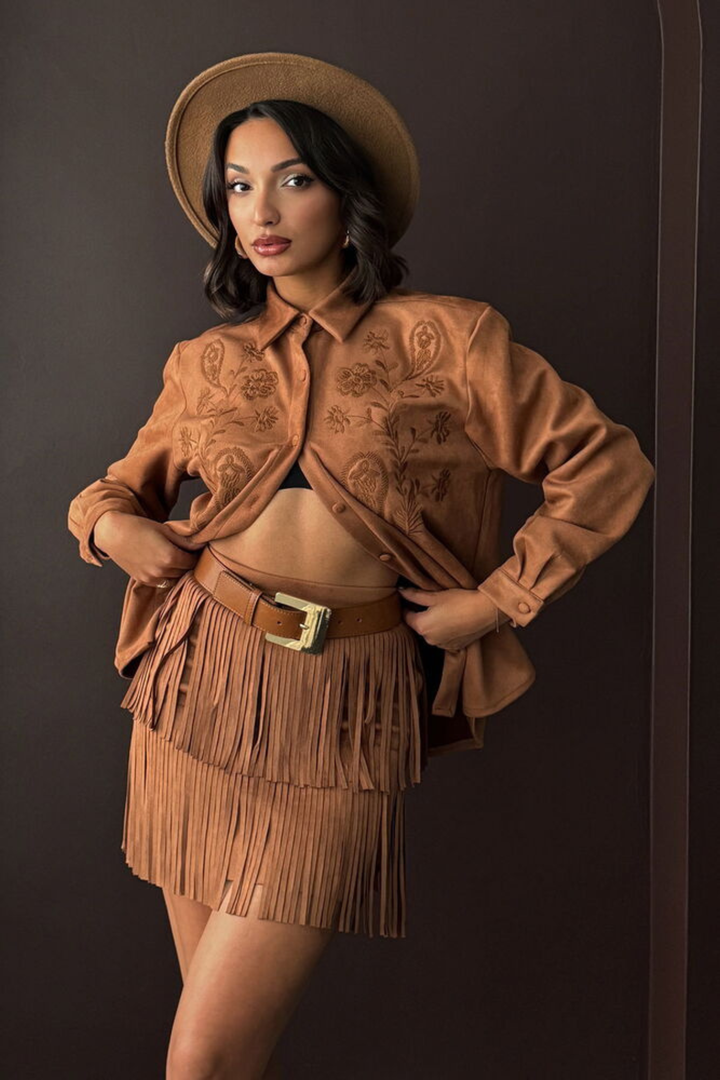 Saddle up in style with the Saddle Fringe Mini Skirt, a Western-inspired showstopper that blends texture, movement, and attitude. Crafted from soft faux suede in a rich mocha brown, this high-waisted mini skirt features two dramatic layers of long fringe, creating a dynamic silhouette that sways with every step. The smooth fitted waistband offers structure and contrast, making it easy to pair with tucked-in blouses, cropped knits, or embroidered tops.