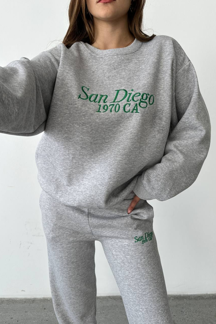 Elevate your off-duty style with the San Diego 1970 Graphic Sweat Set, a cozy-meets-cool essential for laid-back days and casual outings. This matching set includes a sweatpants with a fitted ankle cuff. It is crafted from a soft, breathable cotton blend in a versatile heather gray hue. The bold green collegiate-style print reading "San Diego 1970 CA" adds a vintage varsity vibe, making this set a standout in your loungewear rotation.