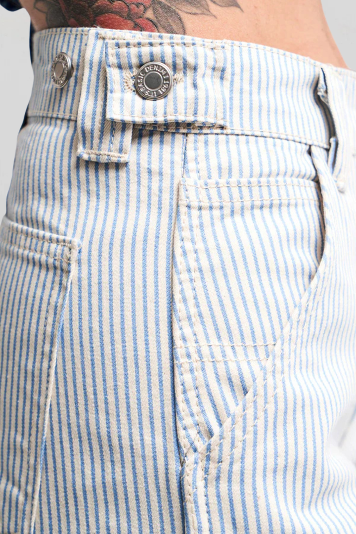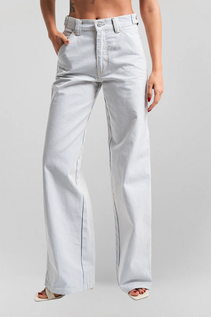 Step into effortless style with the Skyline Stripe Pants, a modern take on classic tailoring. These high-waisted, wide-leg trousers feature a subtle vertical pinstripe pattern in soft blue and white, elongating the silhouette while adding a touch of sophistication. Designed with utility-inspired side pockets, belt loops, and a zipper-button front closure, they blend structure with ease—perfect for both polished and casual looks.