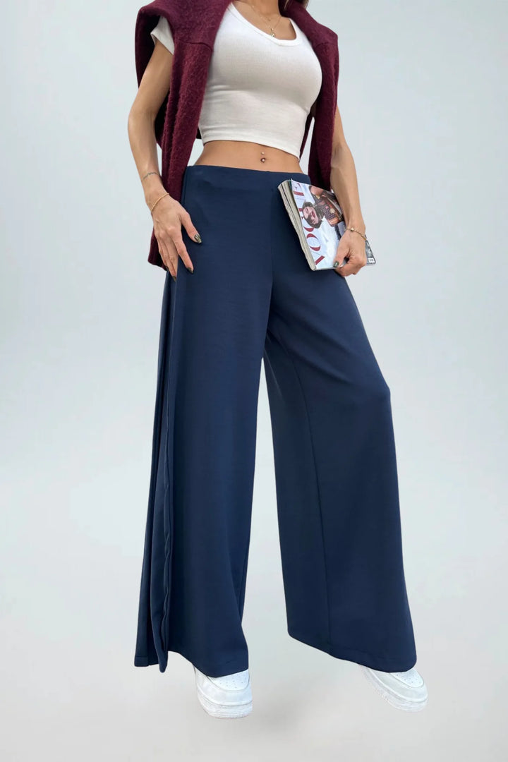 These trousers are your go-to for elevated casualwear. The wide-leg cut brings drama and ease, while the high waist cinches just right. Whether you choose the rich maroon or the cool navy, you're investing in a piece that transitions effortlessly from day to night.