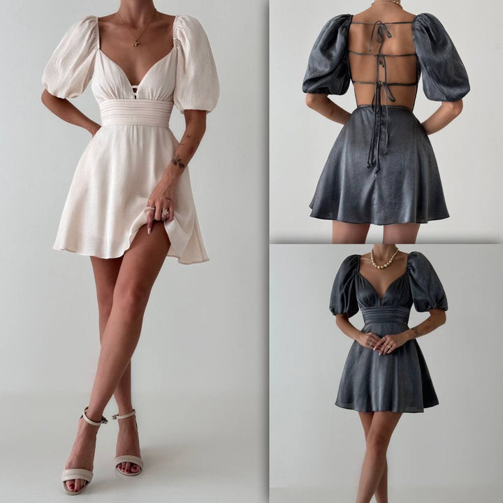 Radiate elegance in this shimmering mini dress featuring a flattering deep V neckline and dramatic 3/4 puff sleeves.