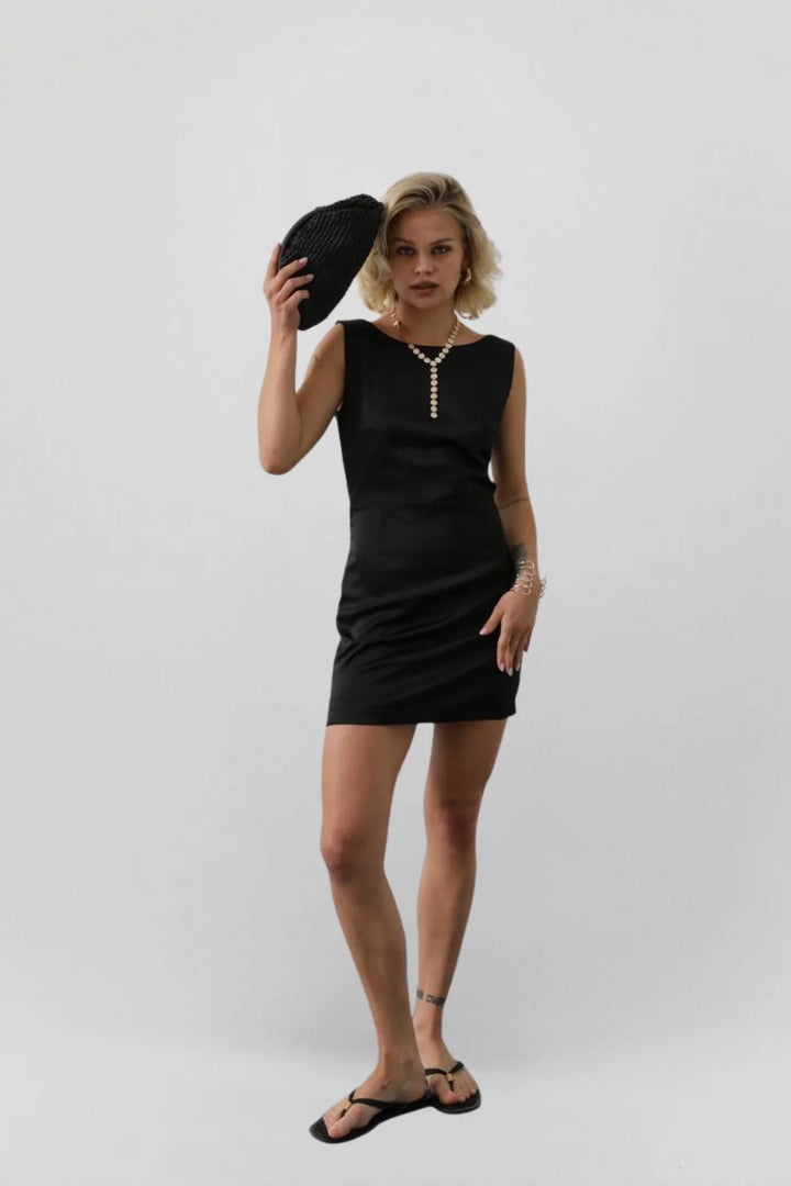 This sleeveless black mini dress features a form-fitting silhouette and a dramatic open-back design, accented by a horizontal strap that adds both structure and allure.